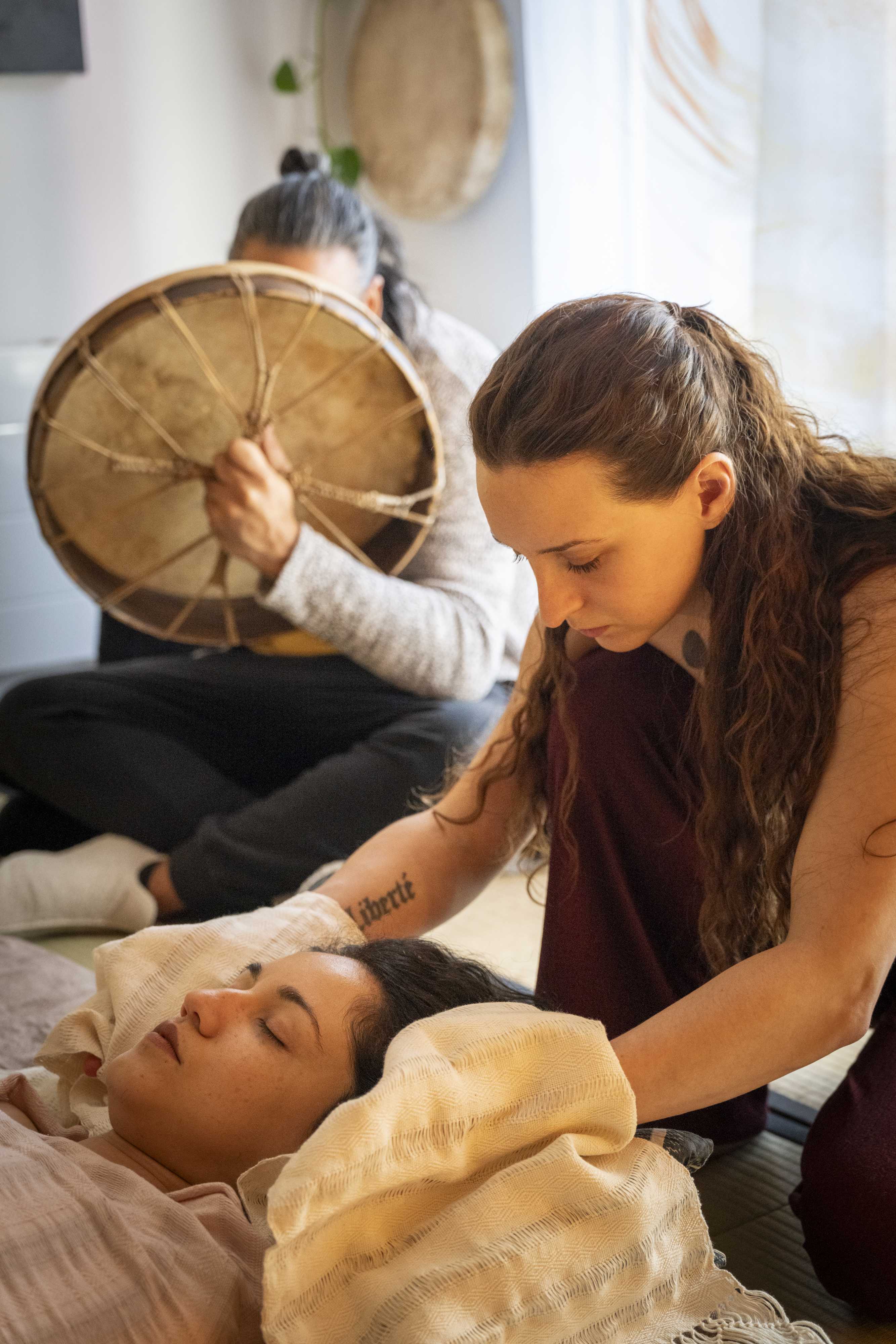 En parallèle, le voyage est porté par les vibrations du tambour, du chant et de différents instruments. Les sons et les rythmes soutiennent l’expérience et guident le corps vers la détente, non pas selon une partition préparée, mais de manière entièrement intuitive.