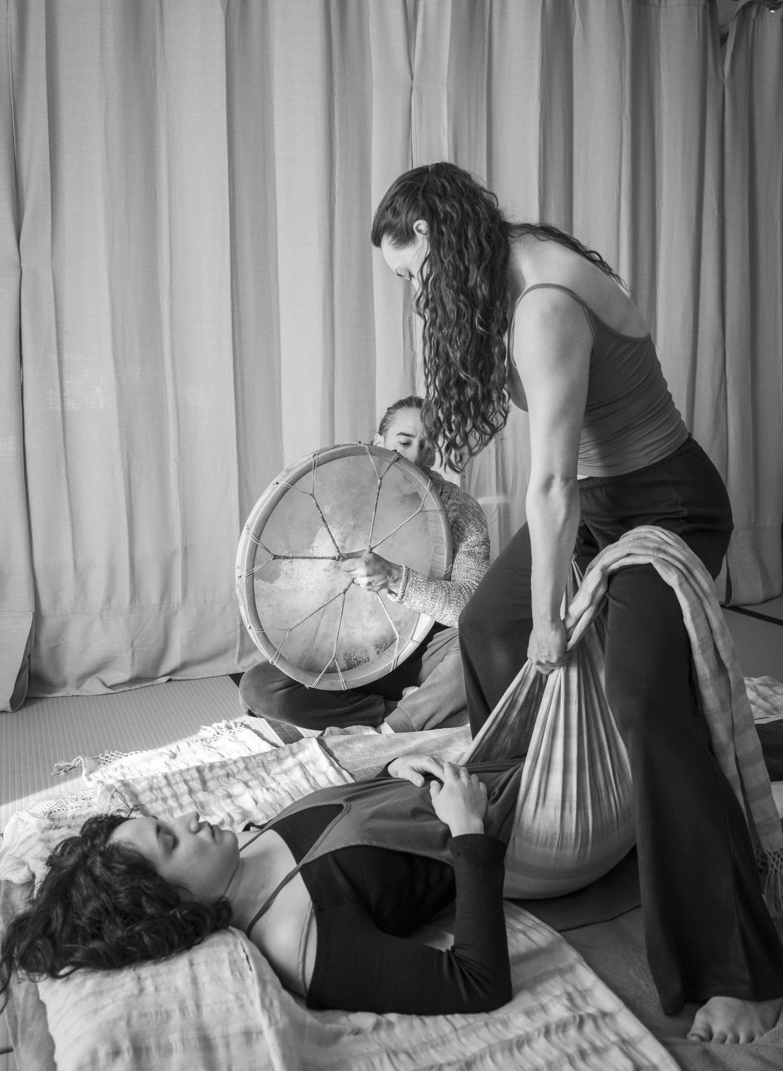 Par le toucher et les rebozos, Cassandra guide le corps dans un mouvement de douceur, de bercement et d’enveloppement.